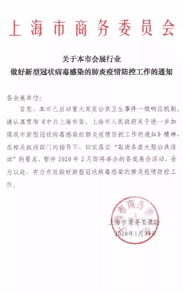 目前,上海市已启动重大突发公共卫生事件一级响应机制。为切实做好抗击疫情工作,根据市政府、市商务委等部门的要求,原定于今年2月在上海跨国采购会展中心举办的各类展会全部暂停。我们将与政府相关部门、各活动主办方保持密切沟通,及时更新展会最新消息。