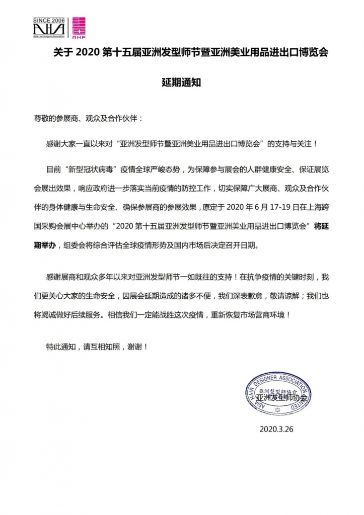 延期通知!!!第15届亚洲发型师节将延期举行!