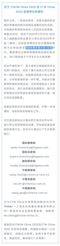 【延期】2020年中国(国际)会奖旅游博览会及中国国际商旅大会延期 2020年2月3日2020年2月10日 xieyanxia 以上通知来源于IT&CM China 2020及CTW China202… Read More